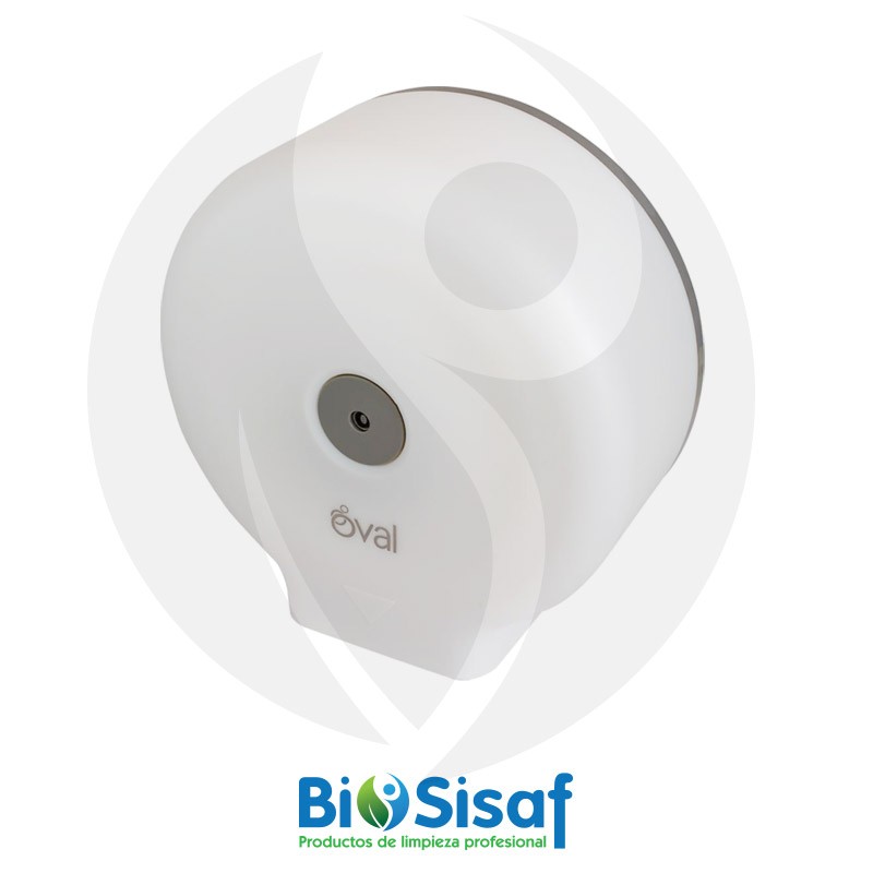 Es un dispensador de papel higiénico en color blanco en bobina junior. Tiene capacidad para rollos de hasta 10 cm de ancho y de hasta 300 mts de largo.