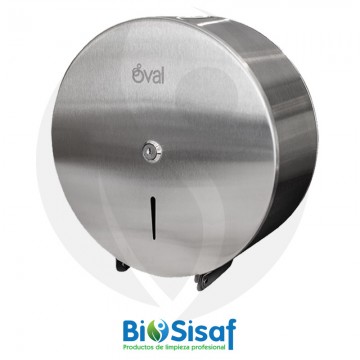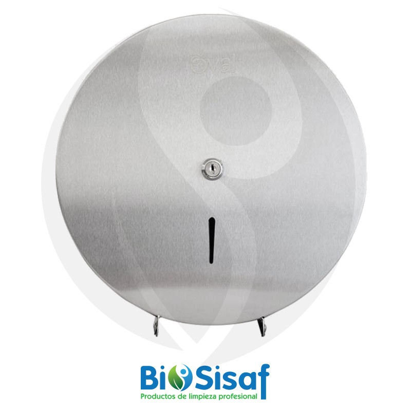 Es un dispensador de papel higiénico en acero inixidable para bobina jumbo. Tiene capacidad para rollos de hasta 10 cm de ancho y de hasta 300 mts de largo.