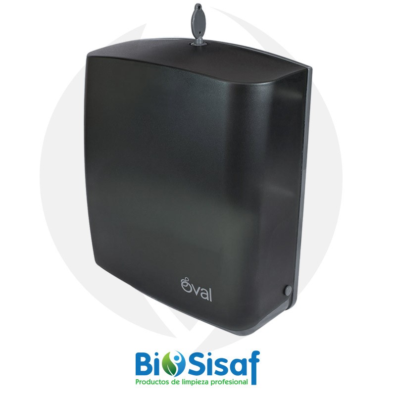 Es un dispensador de toallas interdobladas en Z. Tiene capacidad para almacenar hasta 400 toallas.