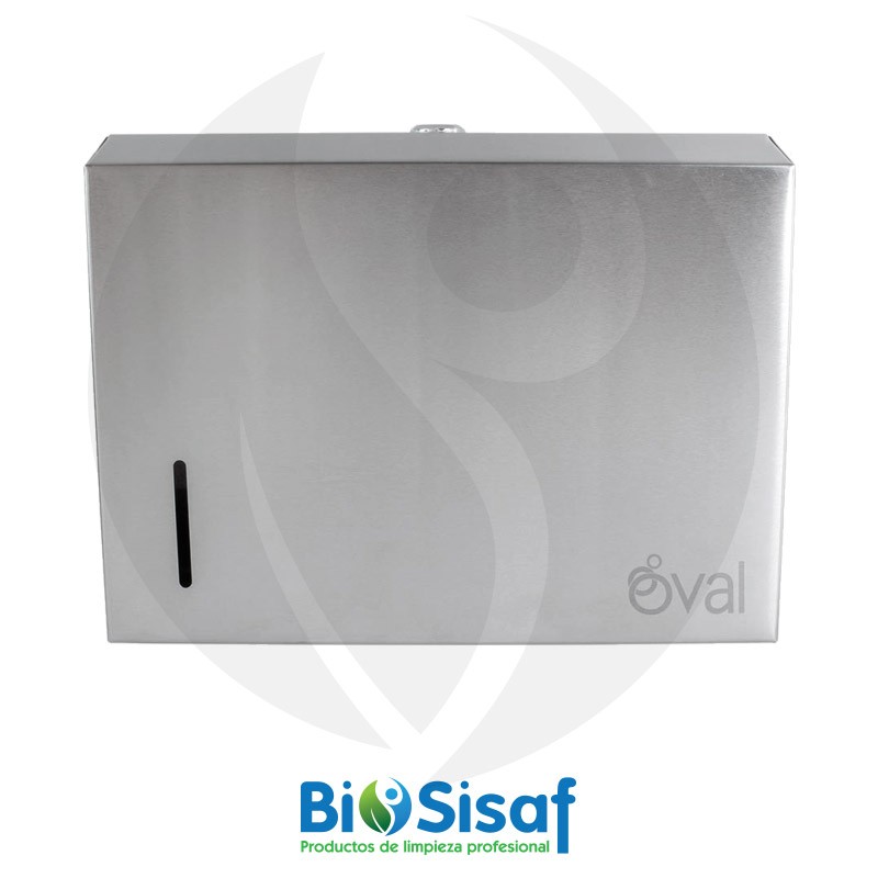 Es un dispensador de toallas interdobladas en Z. Tiene capacidad para almacenar hasta 300 toallas.