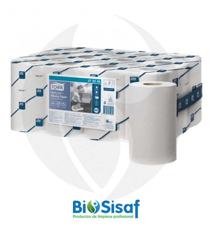 Toalla en rollo TORK Reflex Wiping M3 (Mini), caja con 12 Pz de 343 hjs c/u. De 1 hoja es ideal para tareas de limpieza debido a su resistencia y alta absorción. Color Blanco. COMPATIBLE 473177